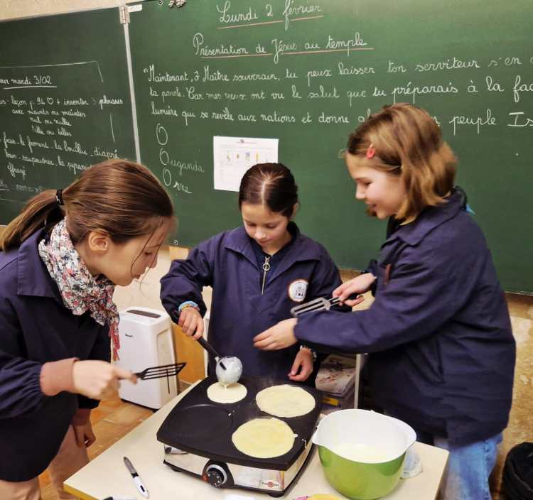 Février 2025 : Enthousiasme général pour la chandeleur, l’occasion d’appliquer la leçon des conversions en préparant la pâte à crêpes !