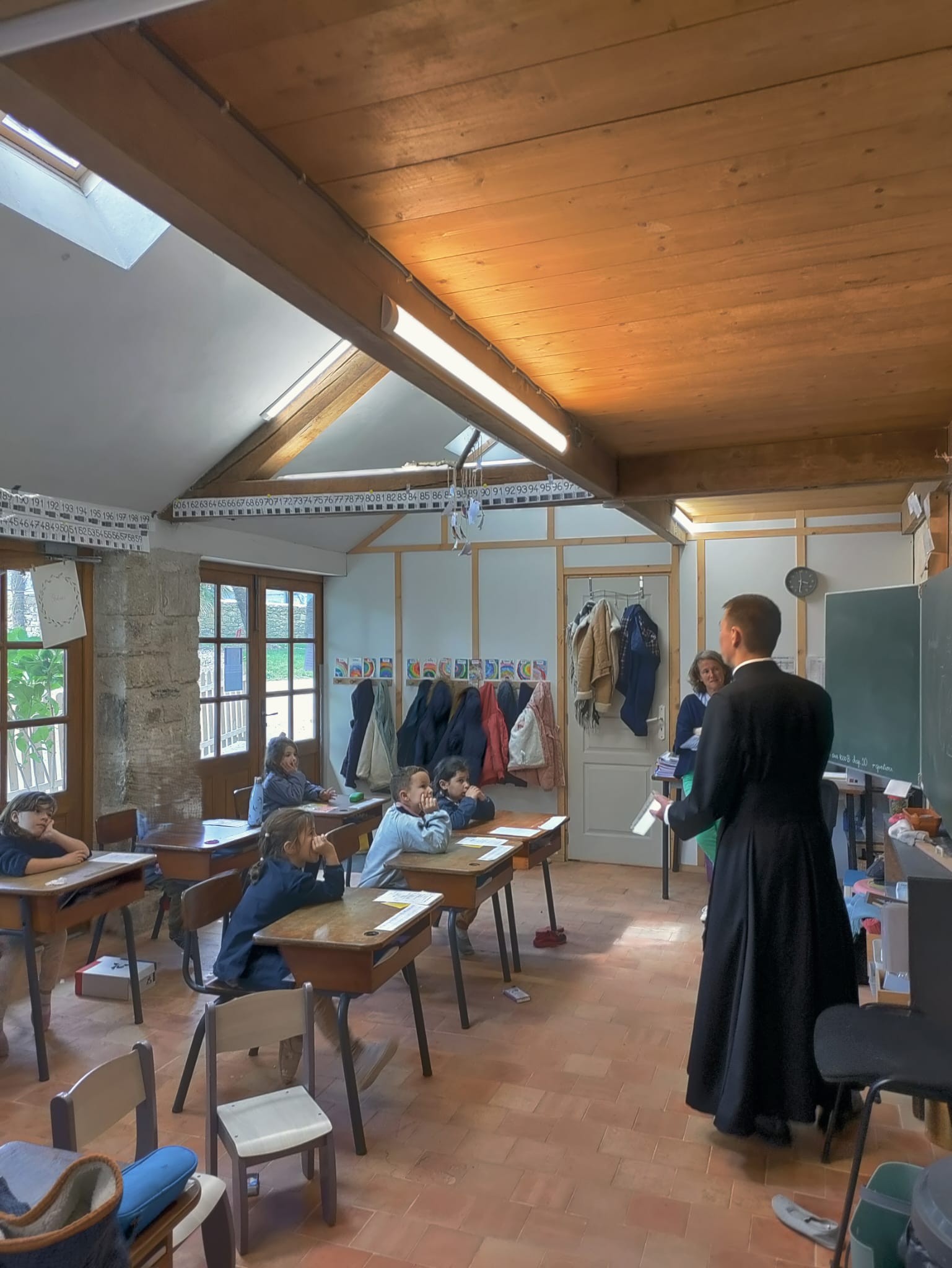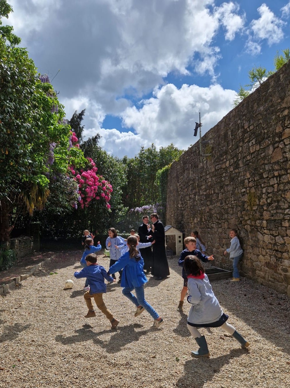 Avril 2025 : Cours de Catéchisme avec les séminaristes de la Fraternité sacerdotale Saint Pierre en vacances, avec « un loup glacé » durant la récréation, un bon et beau moment pour tous !